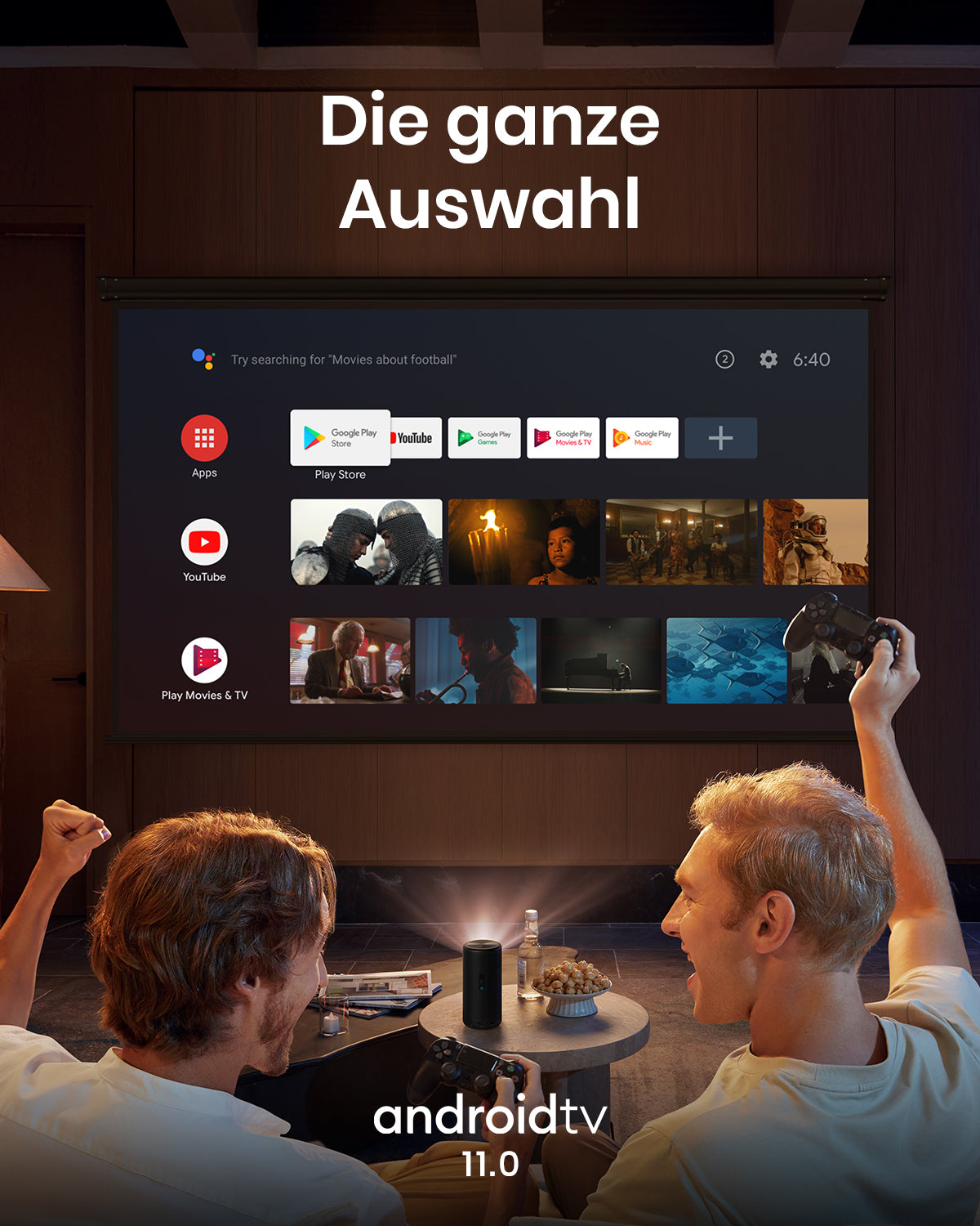 DIE GANZE BANDBREITE AN UNTERHALTUNG: Egal ob Kinofan oder Gamer, Android TV 11.0 bietet eine Fülle von Unterhaltungsmöglichkeiten - für alle Anlässe. Der tragbare Projektor funktioniert mit Google Assistant und Chromecast. Einfach Netflix bei Nebula Play herunterladen und per Nebula Connect steuern!